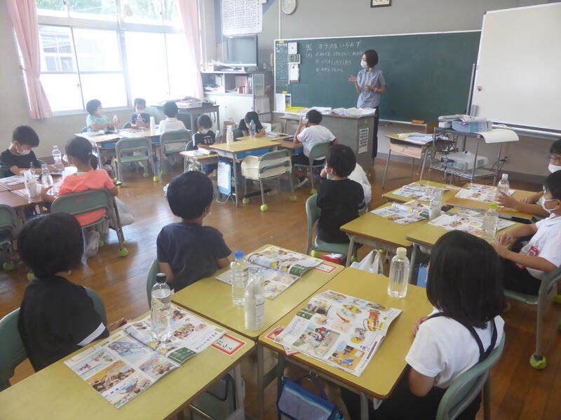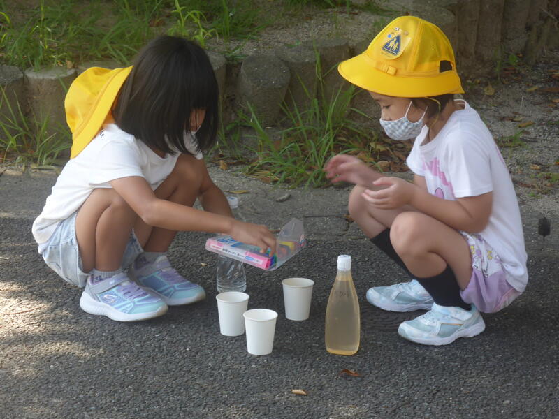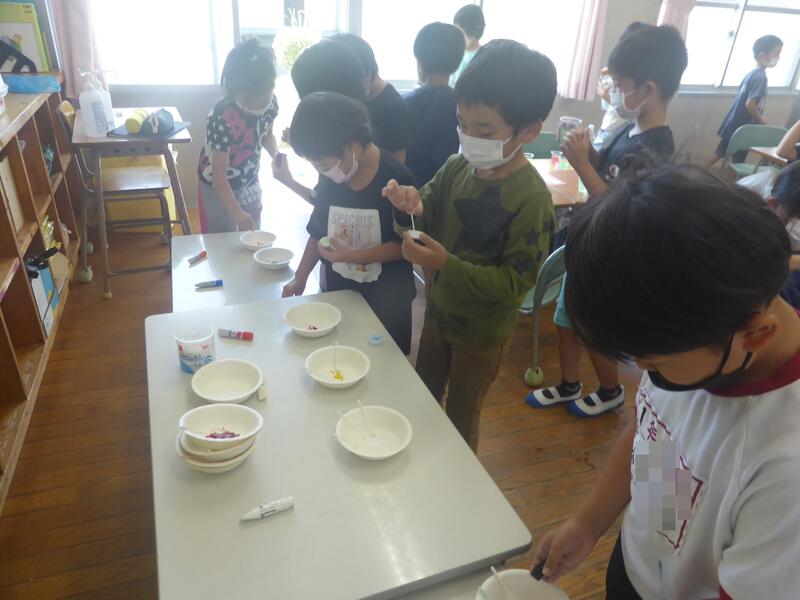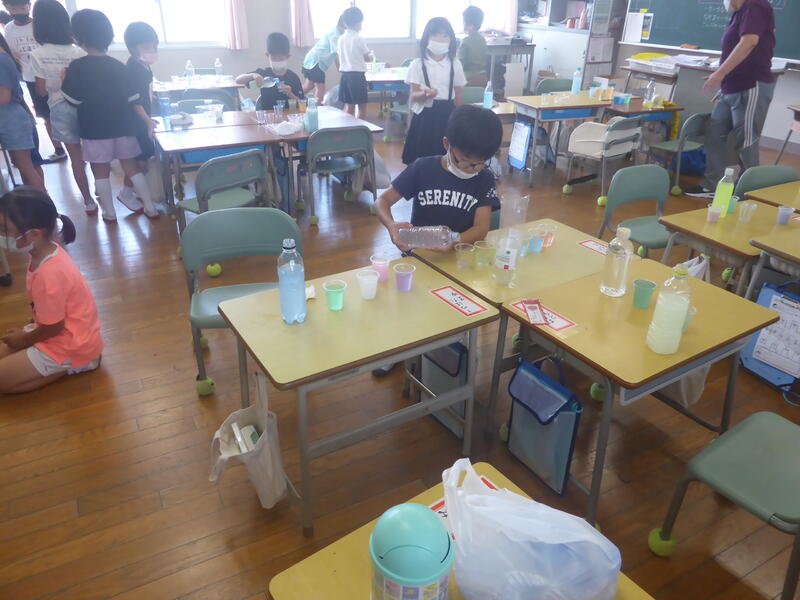 1年図工。カラフルな色水を作ります。聞き方が上手です。