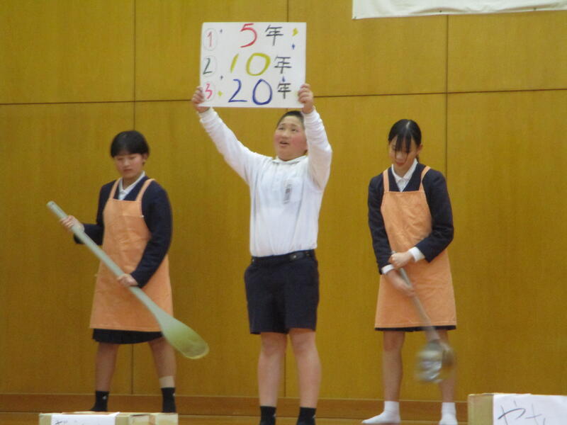 給食委員会は、給食の先生方と業者の方々とのやりとりや調理など先生方の一日を劇にしました。大きなしゃもじやスプーンを使って演技したり、途中にクイズを入れたりして、給食づくりの工夫や大変さが分かる楽しい時間でした。