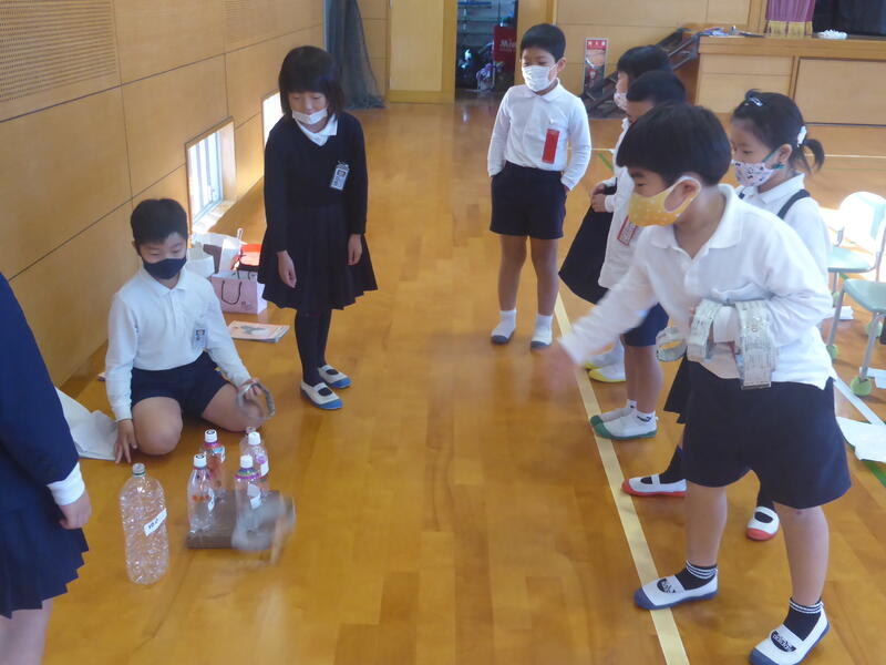 2年生が1年生を招待して行うおもちゃ祭りです。道具づくり、1年への説明を自分たちで考え、進めていました。プレゼントまでもらえる1年生は大喜びです。