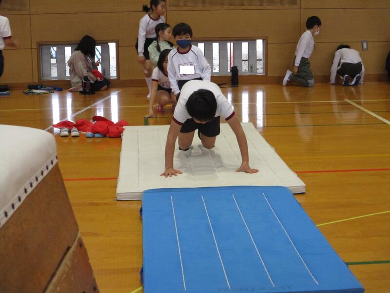 まずマットで腕の支えやバランスを体感するウォーミングアップです。それから跳び箱運動に入る流れです。