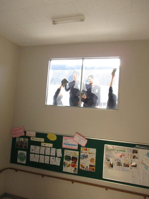 高い位置にある窓。日頃は、目につかない場所のよごれを見つけて、6年生がきれいにしてくれました(窓の向こうはベランダですので、ご安心ください)。