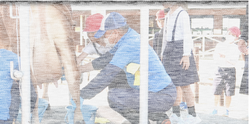 お弁当を食べた後は、牛の乳しぼりに挑戦しました。握り方を何度も確認し、恐るおそる牛に近づいていましたが、上手に乳をしぼることができました。
