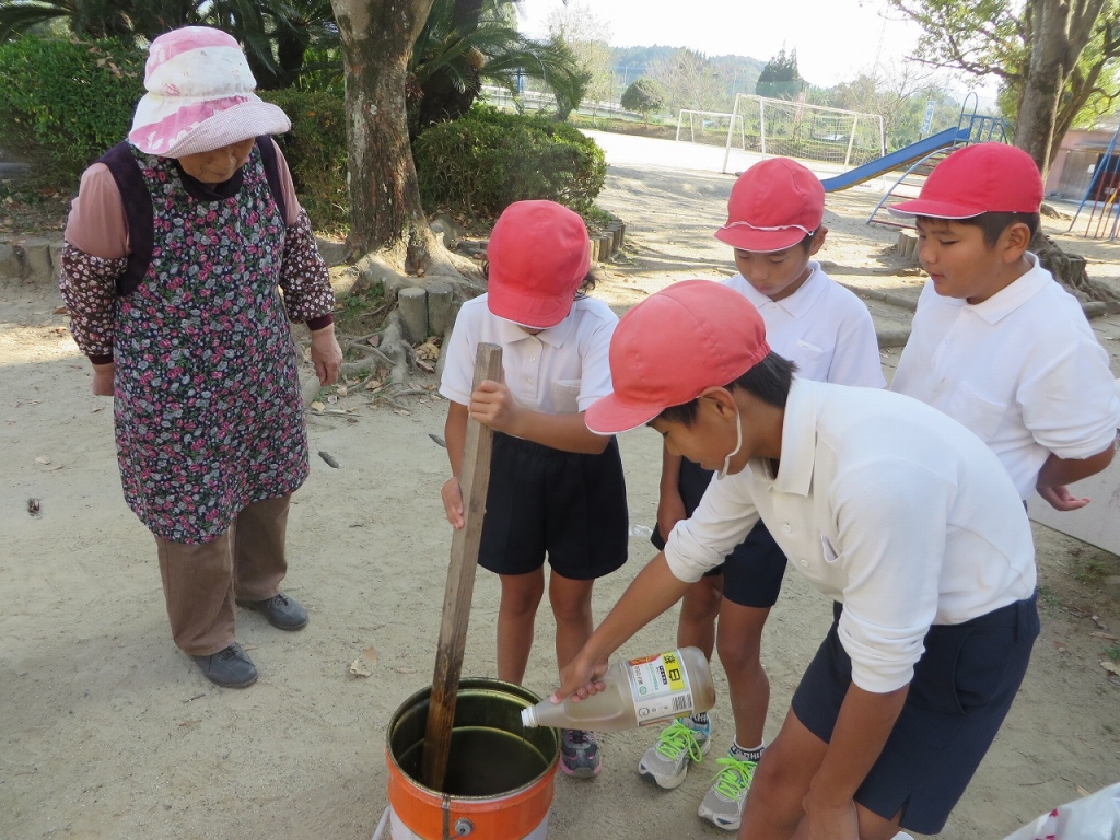 5年生が塩屋の富士田さんのご指導の下、廃油石けん作りを行いました。