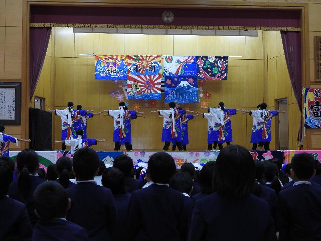 6年生が「ソーラン節」「手もみ肩もみタイム」「ふるさと」を披露し、愛庵まつりに参加しました。