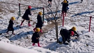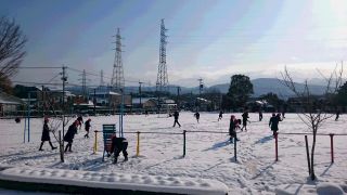 登校した子どもたちは元気いっぱい!さっそく、雪合戦に夢中になっていました。