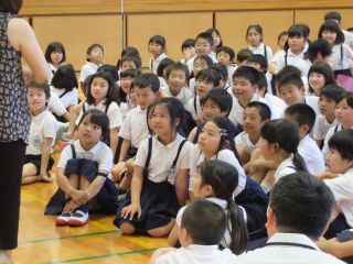 6月13日(月)に、オーケストラのみなさんによる演奏会が本校の体育館で開かれるのですが、その予習として、楽器の種類や音の出し方などについて、楽しくお話していただきました。