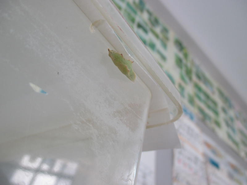 職員玄関前ですくすく大きくなっていたモンシロチョウの幼虫たち。大きくなったら、いつの間にかいなくなるので、鳥が食べていないか気になり、近頃は理科室のケースの中で育てていました。昨日、ケースの壁にはりついてじっとしている幼虫がいたので、翌日はさなぎになるかなと楽しみにしていました。そして、本日。さなぎに変身。連休明けはチョウに変身しているかも?
