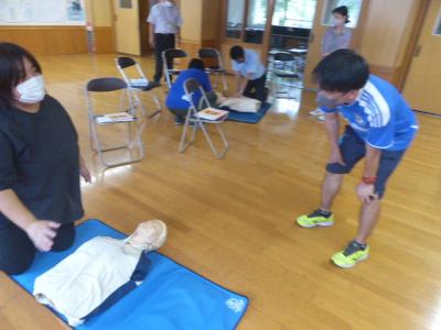 蘇生法の講習として、胸骨圧迫とAEDの使用について研修をしました。蘇生をすべき緊急事態がないように、事前指導や対策は行いますが、万が一起こった際の対処法については身に付ける必要があり、毎年行っています。