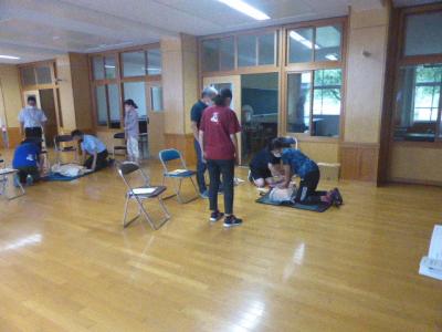 蘇生法の講習として、胸骨圧迫とAEDの使用について研修をしました。蘇生をすべき緊急事態がないように、事前指導や対策は行いますが、万が一起こった際の対処法については身に付ける必要があり、毎年行っています。