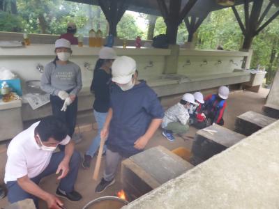 夕食の様子です。火起こし体験を行いました。マッチに悪戦苦闘した子もいたようです。