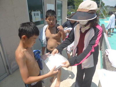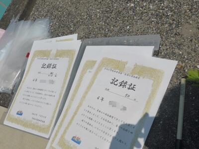 最終日は、泳力を計測します。本人の頑張りとたくさんの先生方のご指導、みんなの声援があり、大幅に伸ばすことができました。1回目の記録40mから、2回目の挑戦で200mまで伸ばす子もいました。終了後、満足そうな表情で記録証を受け取っていました。