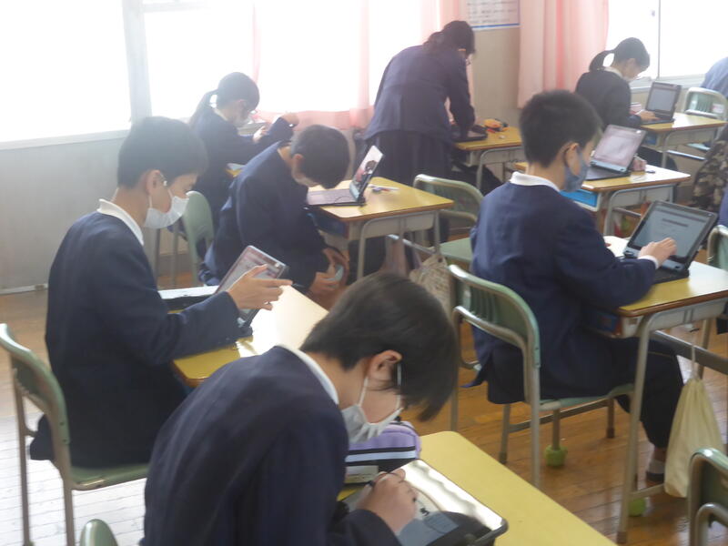 5年生は、短歌を作り、タブレットに保存しみんなで共有する活動をしていました。