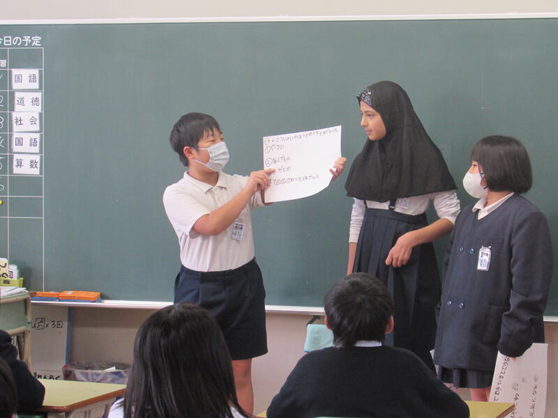 道徳の授業では、子供たちと3つ出会いを大切にしています。1つ目が、教材との出会い、2つ目が、友達の考えとの出会い、3つ目が、自分自身の考えとの出会いです。子供たちが自分の体験と似ているなあと思ってくれるよう工夫しながら進めています。