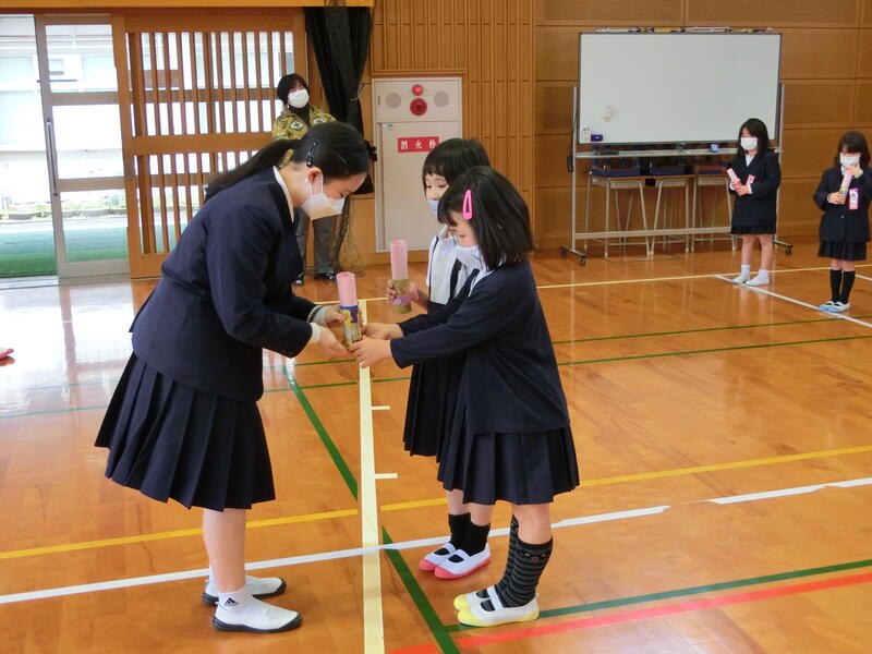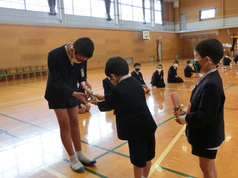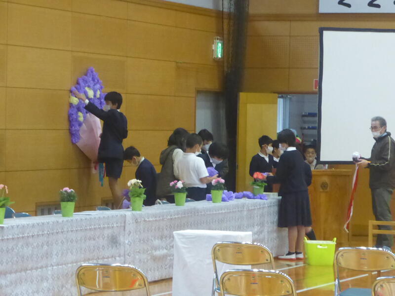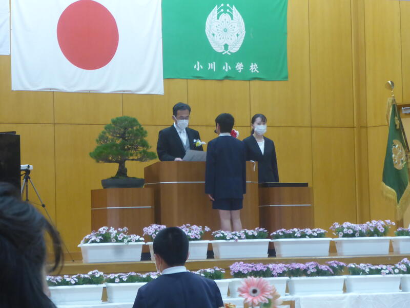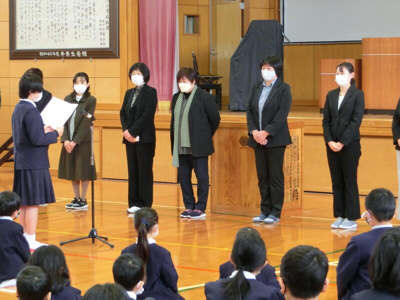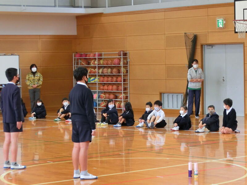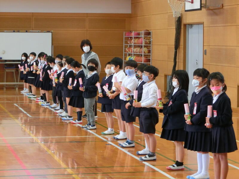 感染防止対策を行い、体育館で集合して実施しました。1年間の成長が伺える集合の仕方、話の聞き方、返事でした。集合して行うと、上学年や互いの姿を見て、学び合うことができます。1年のまとめにふさわしい式となりました。