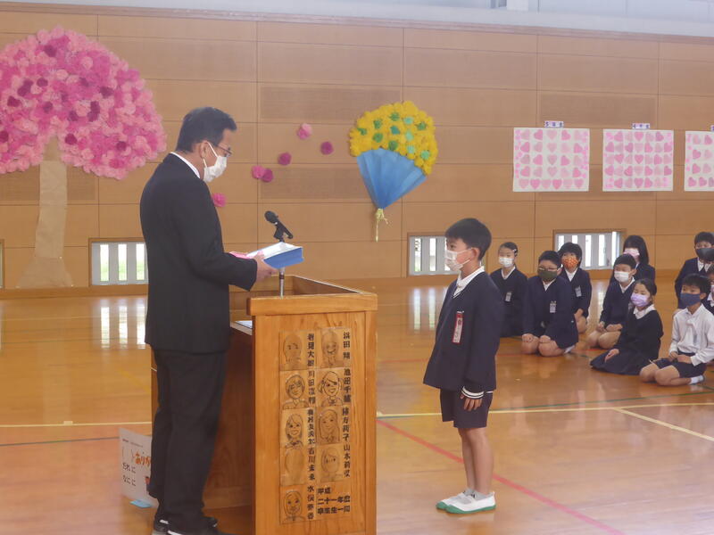 感染防止対策を行い、体育館で集合して実施しました。1年間の成長が伺える集合の仕方、話の聞き方、返事でした。集合して行うと、上学年や互いの姿を見て、学び合うことができます。1年のまとめにふさわしい式となりました。