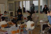 卒業記念にタイヤの色付けを行う6年生が作業の様子をしっかりと見学しました。