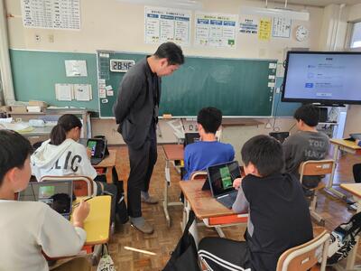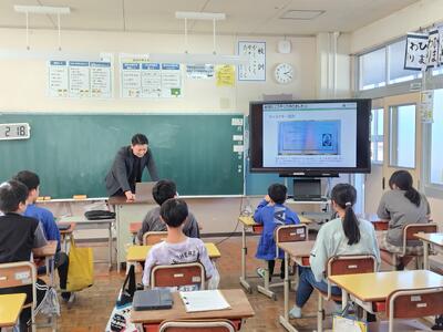 そこで、先日、第1回のクラブの時間に、あさぎり町役場の担当者である遠山さんに、本校に来ていただき、あさぎりクエスト制作の思いやプレイする人達への願いを、子供たちに話してもらいました。