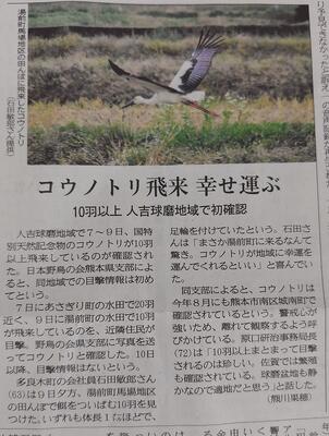 岡原の田んぼに110数羽のコウノトリが飛来した記事です。記事ではあさぎり町の水田となっていましたが、学校近くの田んぼだそうです。