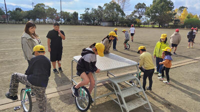 一輪車に乗れる西嶋教諭、田中養護教諭が子供たちのサポートをしていました。