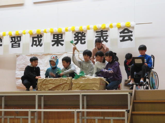 2月2日(日)、本校体育館において、「学習成果発表会」が行われました。書写、図画工作、総合的な学習の時間等での作品を展示するとともに、各学年ごとに、学んできたことを劇などで表現しました。多くの保護者や地域の方々が見守る中、児童は、日ごろの学習の成果を力いっぱい発信することができました。