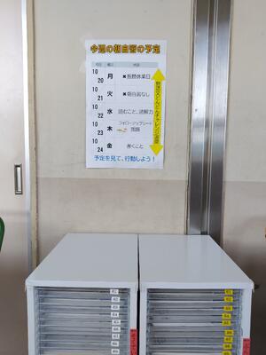 その一つがいわゆる朝自習の時間の活用です。写真のように、廊下に毎週学習すべき内容を子供たちに示します。子供たちは、その時間になると、各自、自分に必要だと思う演習問題を下のケースからチョイスして、取り組みます。この採点には、地域の方々が採点ボランティアとして参加してもらっています。学校、地域をあげての岡原小学力向上大作戦です!