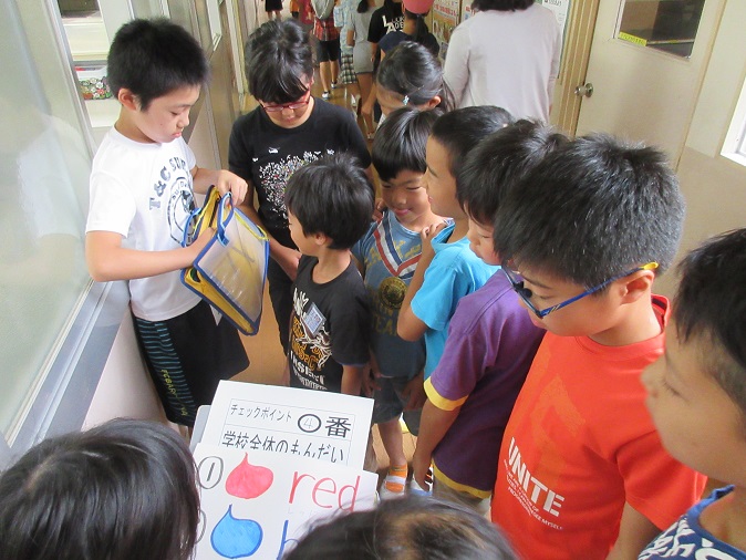 6月14日(木)の児童集会では、縦割り班ごとに学校を回り、先生方から出題されるクイズに答える「縦割り班対抗クイズラリー」が行われました。なんと今回はクイズの答えを英語で解答!