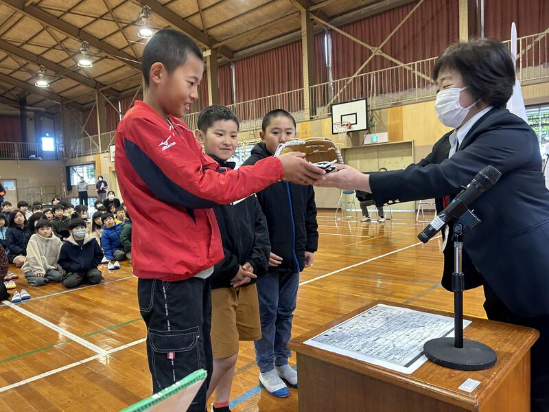 児童の代表3名に、校長先生からグローブが受け渡されました。