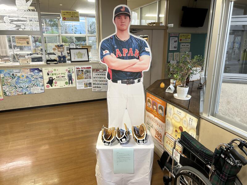 贈呈された3個のグローブは、等身大の大谷選手のパネルとともに、玄関に飾ってあります。