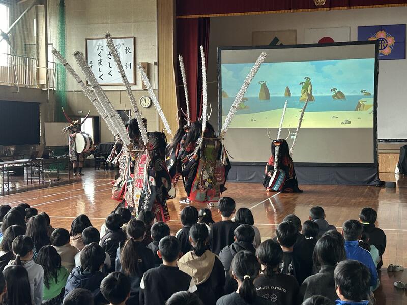 次に、郷土芸能の説明があり、岩手県の鹿踊りとあさぎり町上地区の柳別府太鼓踊りの実演を鑑賞しました。