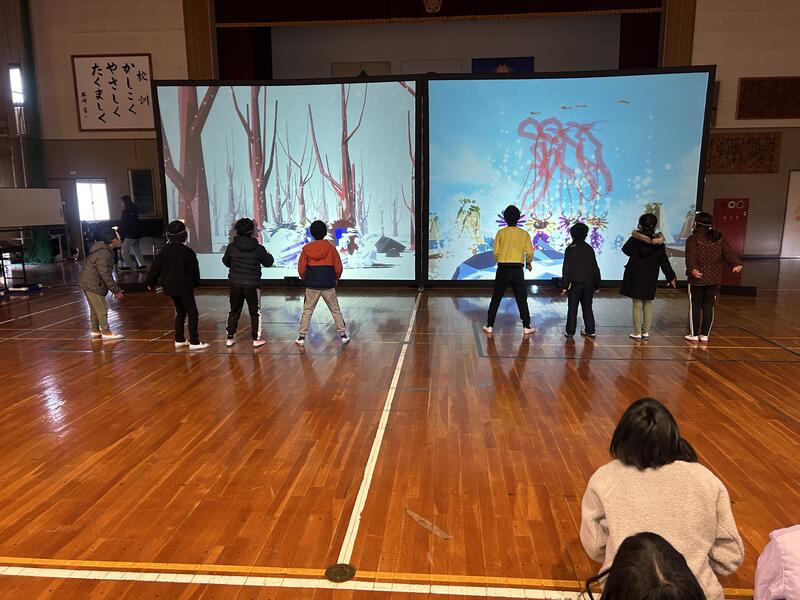 雪を投げる動作、魚を手繰り寄せる動作が、一挙手一投足、画面に反映され、子供たちは夢中になりました。