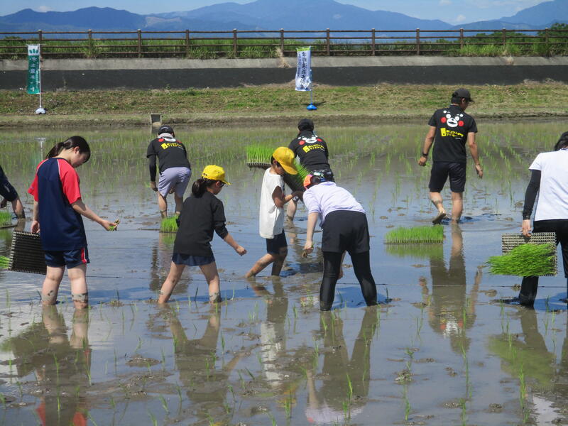 午後からは、球磨川沿いの田んぼに移動しました。実際の水路を見学した後、田植えをしました。