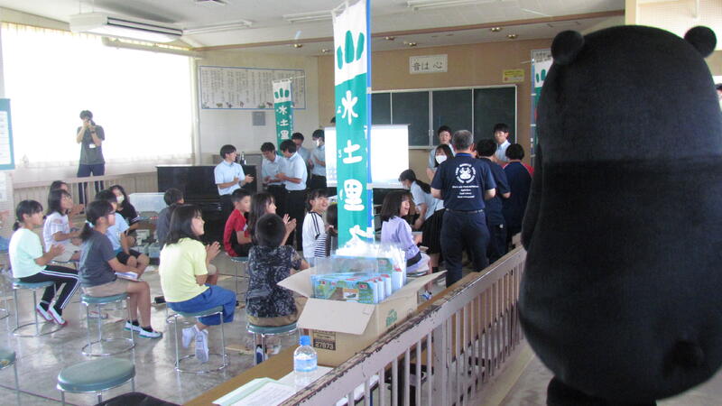 な、なんと、くまモンが登場! 4年生と一緒に田んぼダムについて学ぼうと、岡原小学校に来てくれたのです!