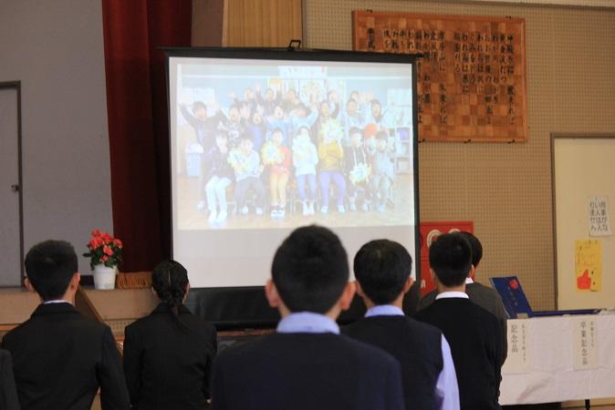 式の後、サプライズがありました。卒業式に参加できなかった下級生(各学年ごと)のビデオメッセージが流されました。共に過ごした日々は忘れません。
