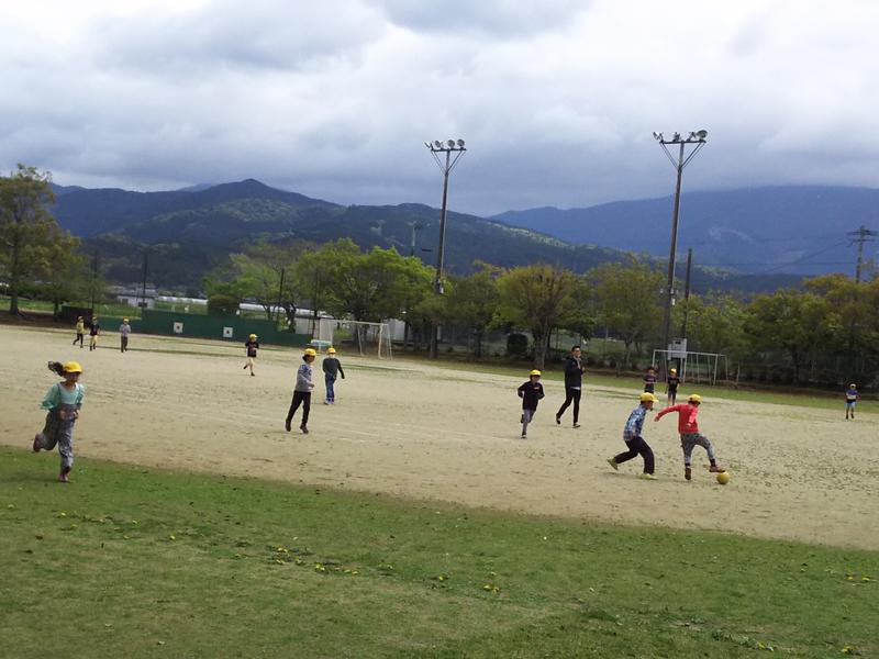 また、子ども達にとっては、いつも学校で勉強している英語を実際に使う、絶好の機会にもなり、昼休みには、2年生の子ども達が、職員室で休んでいるスカイラーを「レッツゴー、グランド!」と誘いにきて、運動場でスカイラーと一緒にサッカーや鬼ごっこをしていました。岡原小の子ども達の英語力、期待できます!