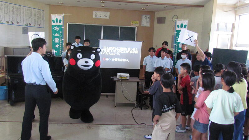 な、なんと、くまモンが登場! 4年生と一緒に田んぼダムについて学ぼうと、岡原小学校に来てくれたのです!