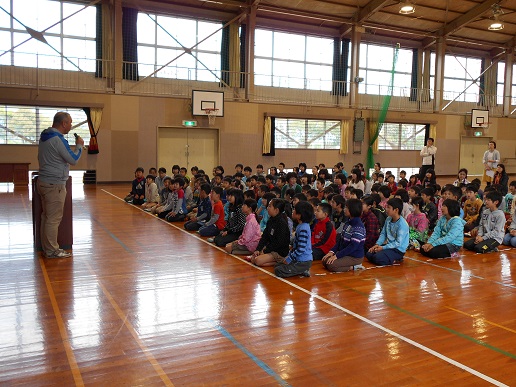 朝から全校集会がありました。「岡原小マナー」のお話があった後、