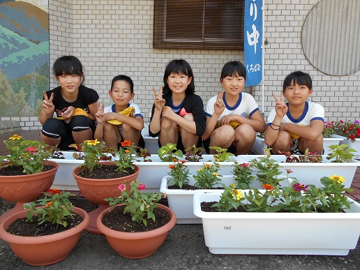 5・6年生の委員が手際よくプランターにサルビアやジニアの苗を植えました。