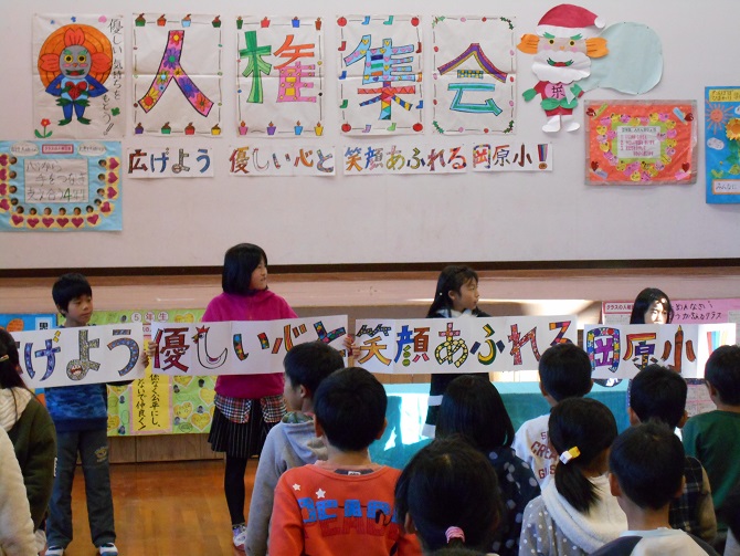 みんな、真剣に見てくれました。岡原小の人権目標に近づけた集会にできたと思います。