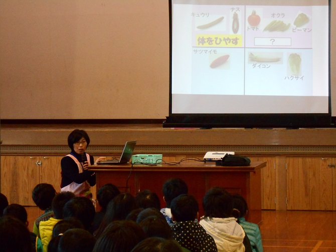 その後、栄養教諭の田代先生から旬の野菜の栄養についてお話がありました。