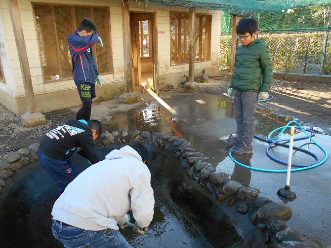 外での活動を行う飼育委員会は、冬の冷たい時期は池の掃除も辛いものがあります。でも合鴨たちのために