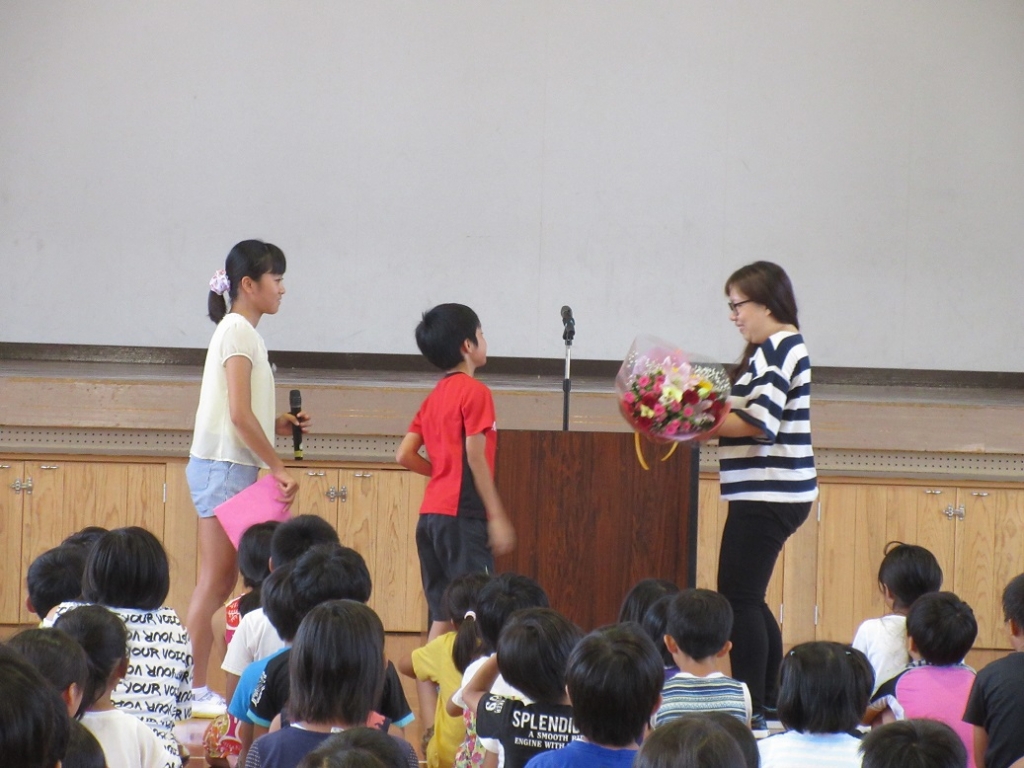 2学期から、ジョイス先生はあさぎり中学校に行かれます。児童代表の6年生が「また、あさぎり中学校で会えるのを楽しみにしています」と感謝とお別れの言葉を送っていました。あさぎり町にはいらっしゃるので、お店などで会えたときは、「Hello!」と元気に声をかけてほしいと、おっしゃっていました。