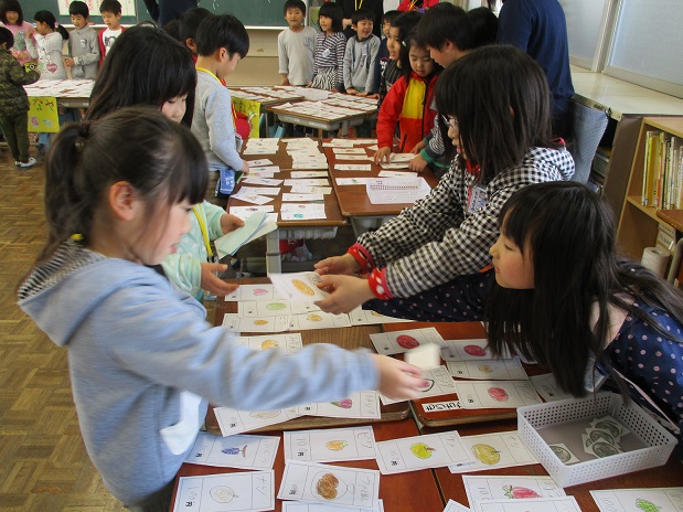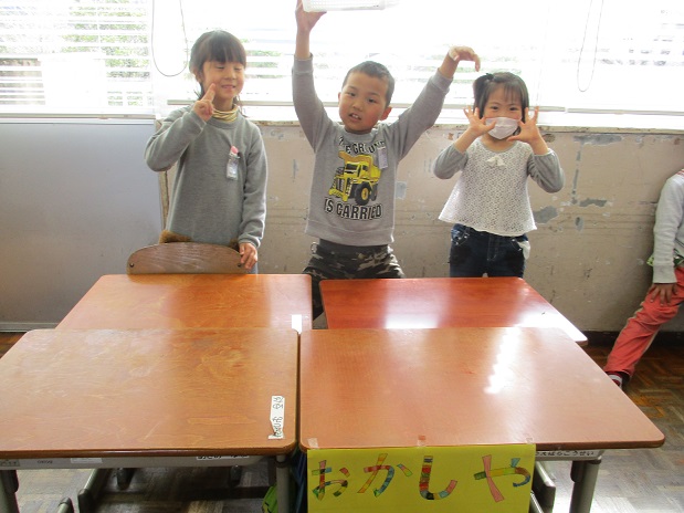1年生が国語のお勉強で準備した品物や紙のお金をつかって、「おみせやさんごっこ」をしました。