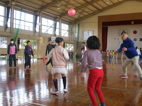 体育館でのドッヂボールを6年生と2年生がとても楽しそうにしていました。