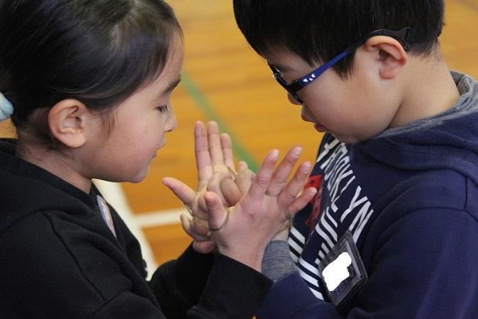 2月14日(木)に、1年生は生活科の学習でおじいちゃんおばあちゃんと一緒に昔遊びをしました。お忙しい中、子ども達のために昔遊びを教えに来ていただき、ありがとうございました。