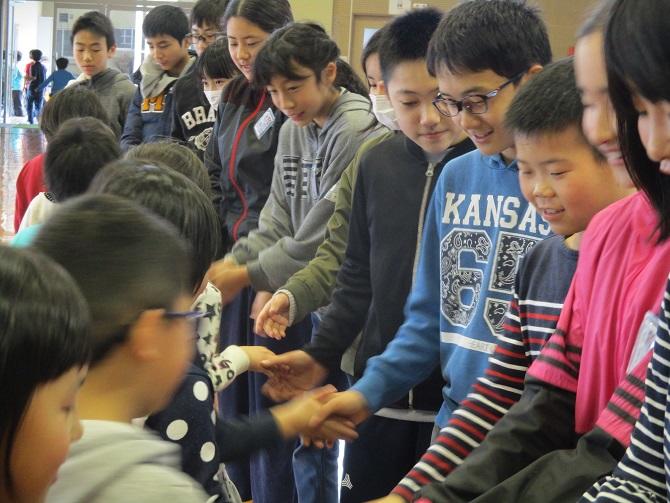 最後には、こんな長い列に!!!勝ち残った班は、6年生に一人ずつお礼の言葉を言いました。