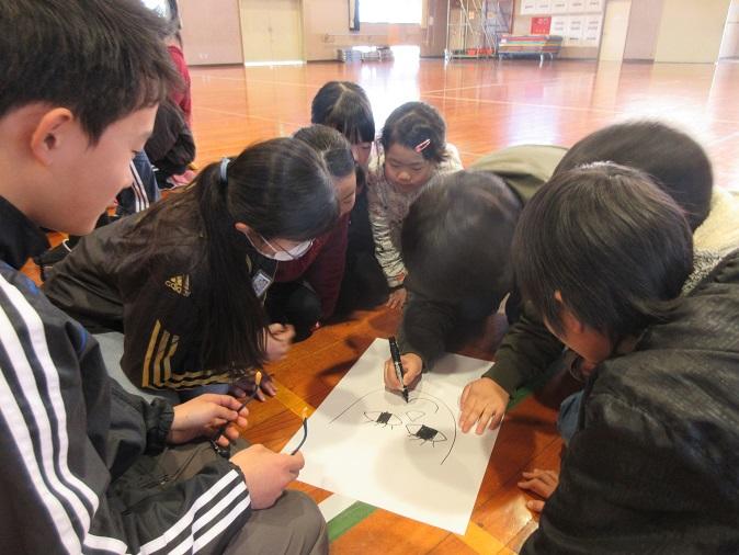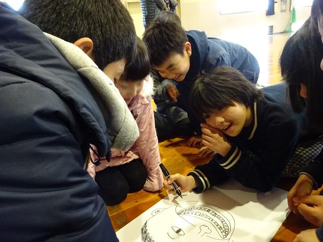 次は縦割り班似顔絵リレー!6年生の顔のパーツを一人ひとり順番に書いて完成させました。