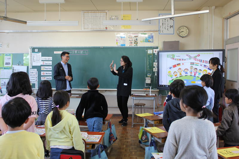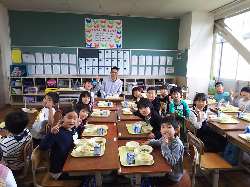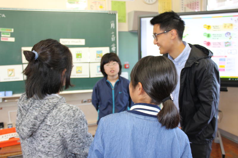 4月17日(水)と19日(金)の二日間、アメリカからのお客さんが岡原小学校に遊びに来てくれました。スカイラーという大学を出たばかりの若い男性で、子ども達と一緒に勉強したり、遊んだりしてもらい、子ども達も大喜びでした。