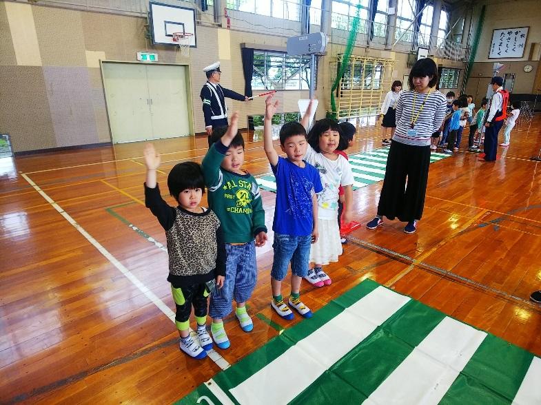 1・2年生の交通安全教室では、横断歩道の安全な渡り方について学習しました。「手を挙げて!右見て!左見て!右見て!横断!」たくさん練習して上手になりました。