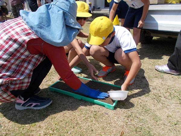 5年生は総合的な学習の時間で米作りに挑戦します。題して「岡原っ子米つくりに挑戦!」です。まずは種まきです。5月24日(金)、JAくま青壮年部岡原の方々にお手伝いいただき、取り組みました。