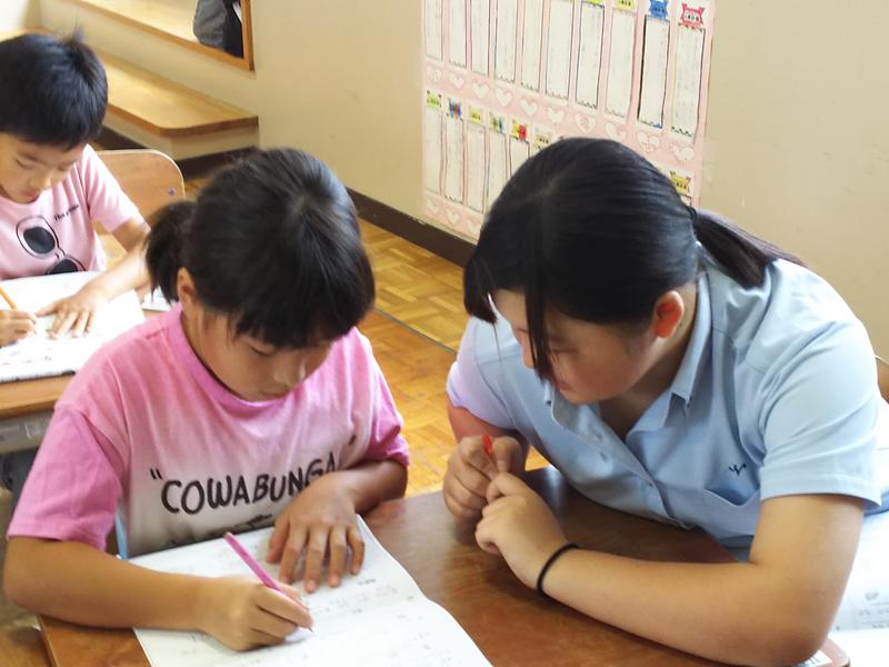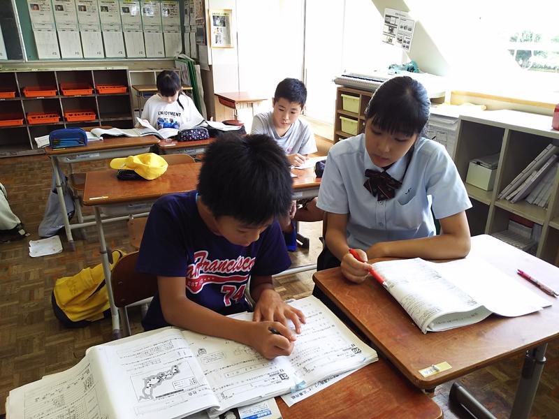 岡原小学校では、夏休みにそれぞれの学年で学習会を開きますが、今年は8月20日から22日の3日間、地元、南稜高校のお姉さんたちが、学習会に参加して、勉強を教えていただきました。